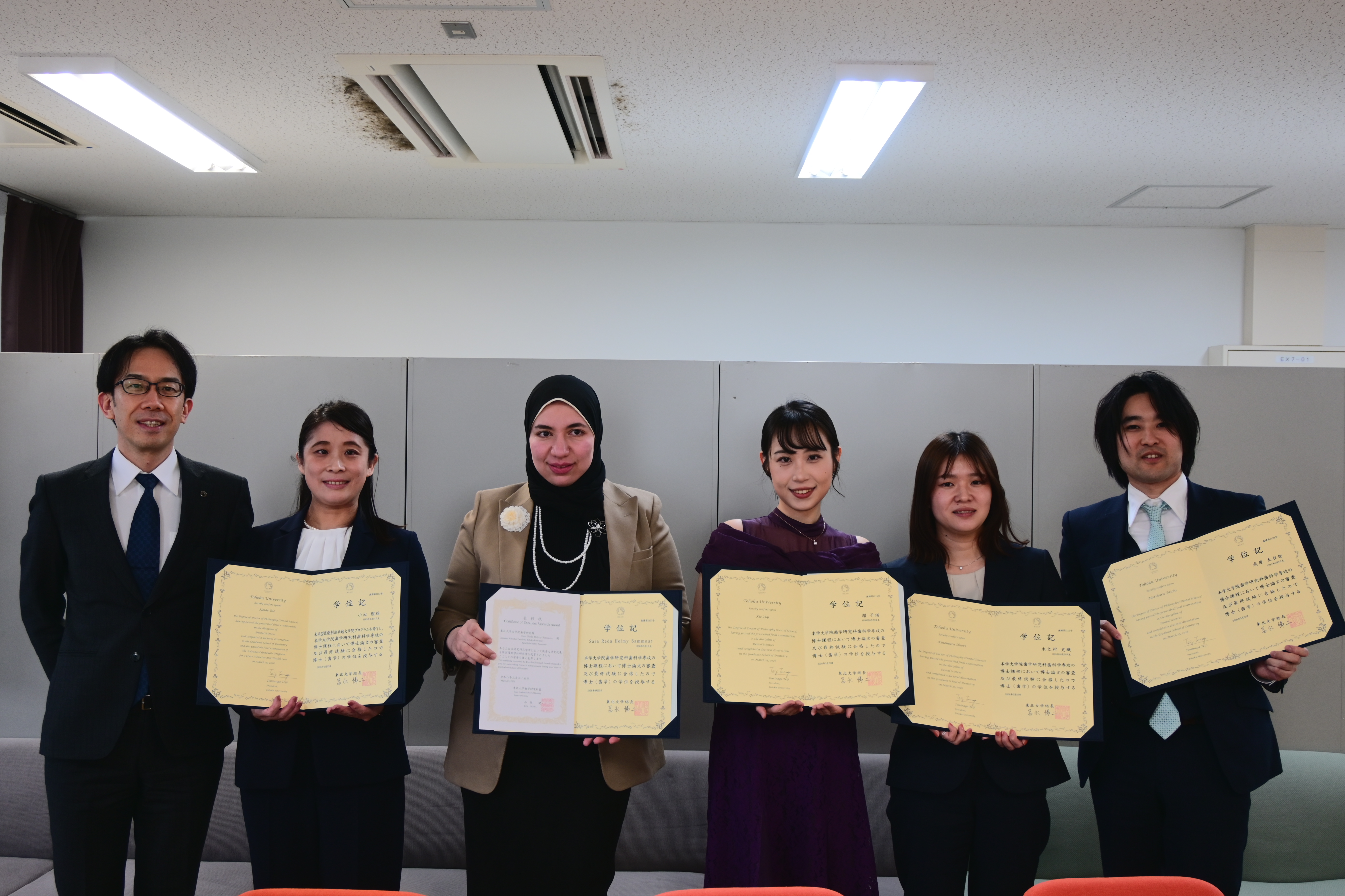 - 成原大衣智先生、木之村史織先生、Xie Ziqi先生、Sara Reda Helmy Sammour先生、小出理絵先生(写真右より)の5名が学位記授与式を終え、歯学博士の学位を取得されました。心よりお祝い申し上げます。