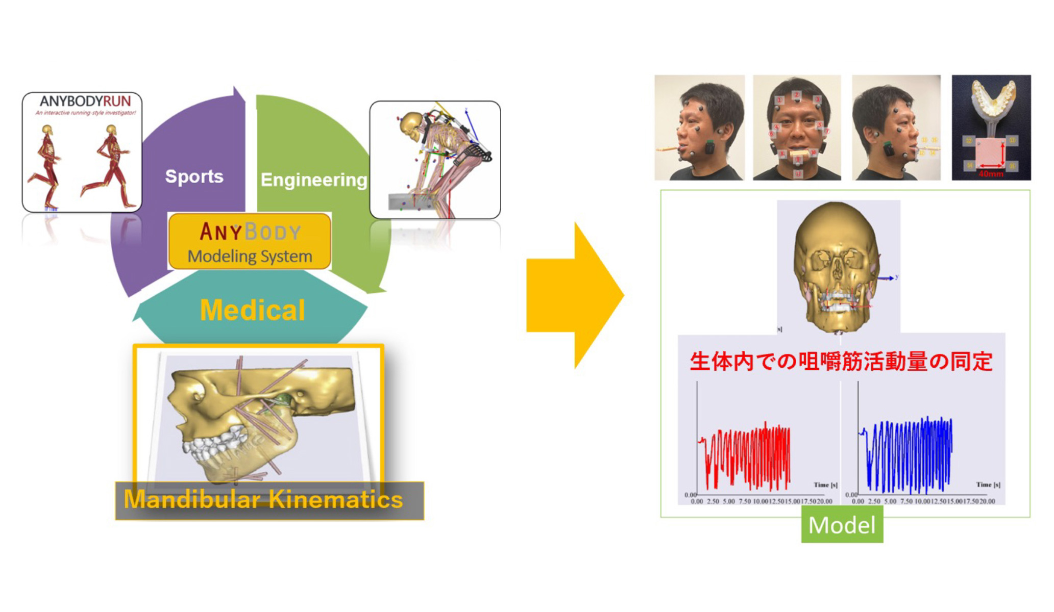本研究は,ヒトの下顎運動を適切に評価するための評価方法を生体シミュレーションに基づいて実現することを目的としています.逆動力学という手法を用いて,個人差のある下顎運動の様子を忠実に再現する,ヒト筋骨格解析システムを構築しました(Shigemitsu.et al, Advances in Transdisciplinary Engineering, 11, 108-104, 2020).